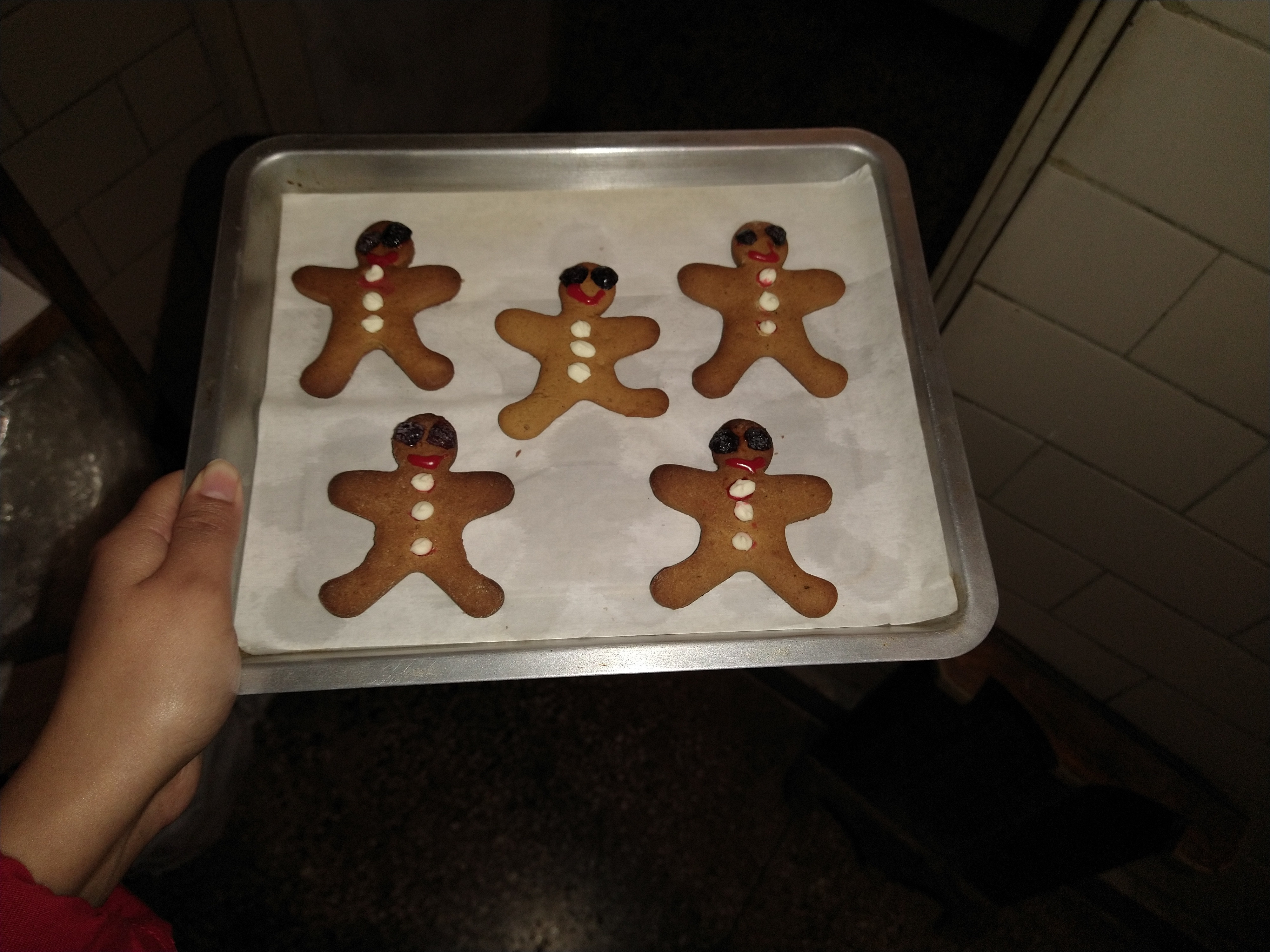 - Spread out the shapes on a lined baking tray and set the oven for 175°C for about 10-12 minutes. Let it cool before smearing with icing. Use the chocochips and raisins to make buttons and eyes. Name it Gingy. Show no mercy and bite its head off.